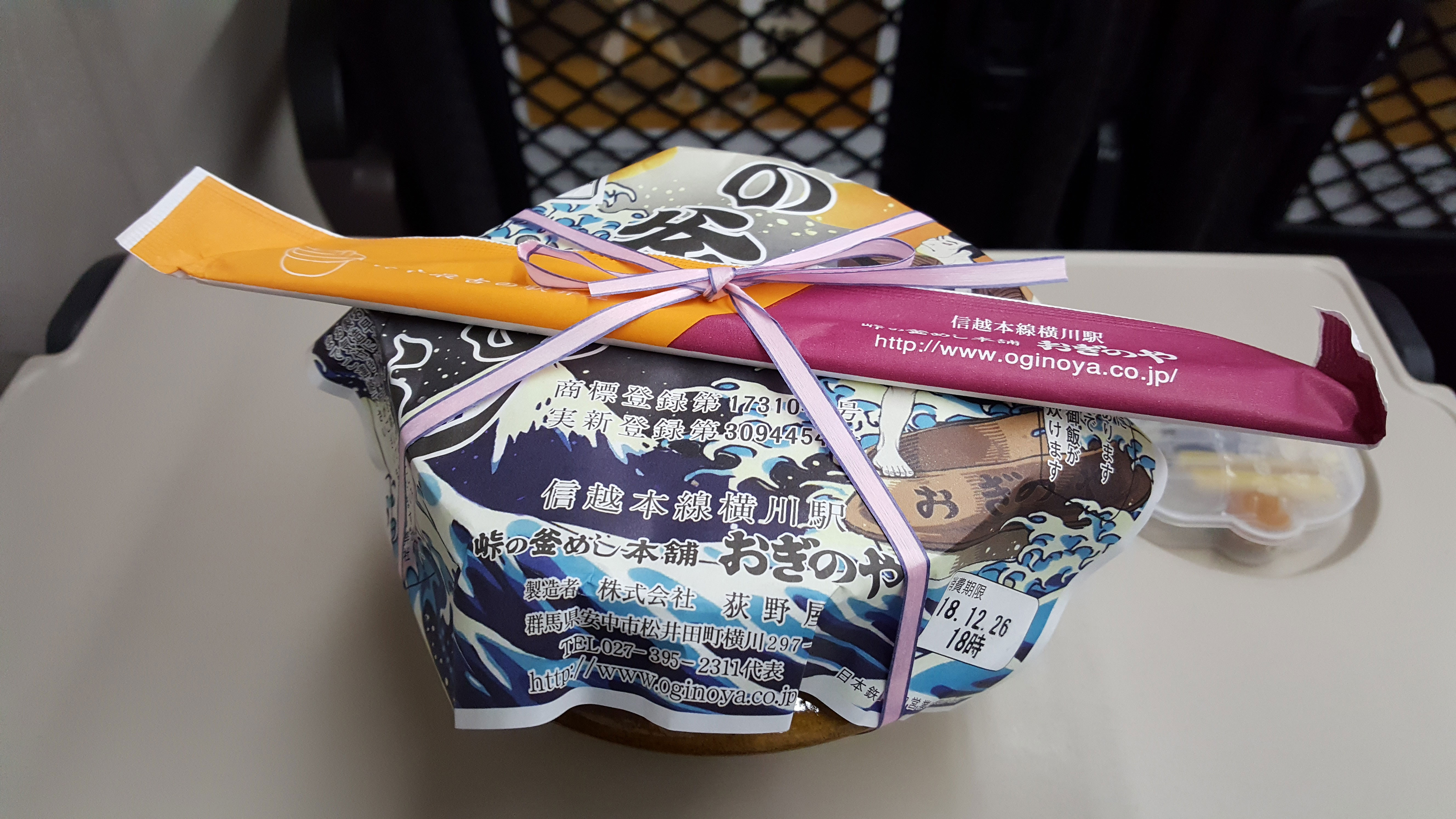 ร้านโองะโนะยะพอแกะเชือกเปิดฝาออกก็ตื่นตามากๆ เพราะเป็นข้าวอบกับไก่ทอดคลุกซอส พร้อมลูกพลับอบแห้ง เกาลัดอบ ไข่นกกระทาต้ม และผักแปรรูปนานาชนิด เช่น ถั่วลันเตา หน่อไม้ รากไม้ ผักดอง บ๊วยดอง ฯลฯ รับประทานจนเกลี้ยงเลย เพราะผักท้องถิ่น ไม่ว่าจะผัด หมัก หรือดอง อร่อยทั้งหมด และยังเป็นข้าวโคชิฮิคะริ (Hoshihikari) ด้วย จึงรู้สึกว่าคุ้มราคา 1,280 เยน เพราะเก็บภาชนะกลับมาเป็นที่ระลึกได้อีกต่างหาก ร้านนี้เป็นหนึ่งในร้านดังของจังหวัดนี้นะงะโนะ และจังหวัดกุมมะ (Gunma) ที่เปิดขายมาตั้งแต่ปลายทศวรรษที่ 50 แล้ว