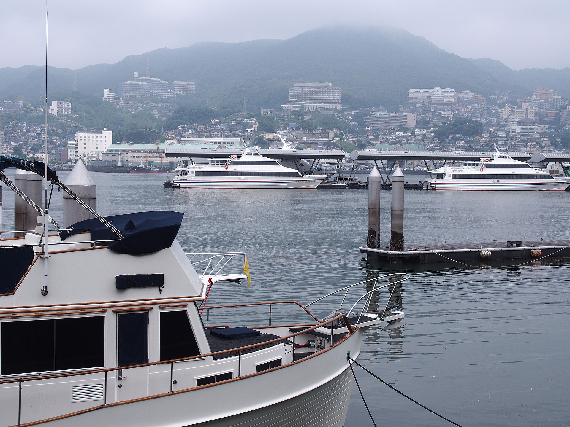 ทิวทัศน์ Nagasaki dejima wharf ท่าเรือเล็กที่พัฒนาพื้นที่ให้เป็นแหล่งรวมร้านอาหาร และคาเฟ่ริมทะเล ซึ่งตอนเย็นจะตั้งโตะริมระเบียงไม้กันเลย