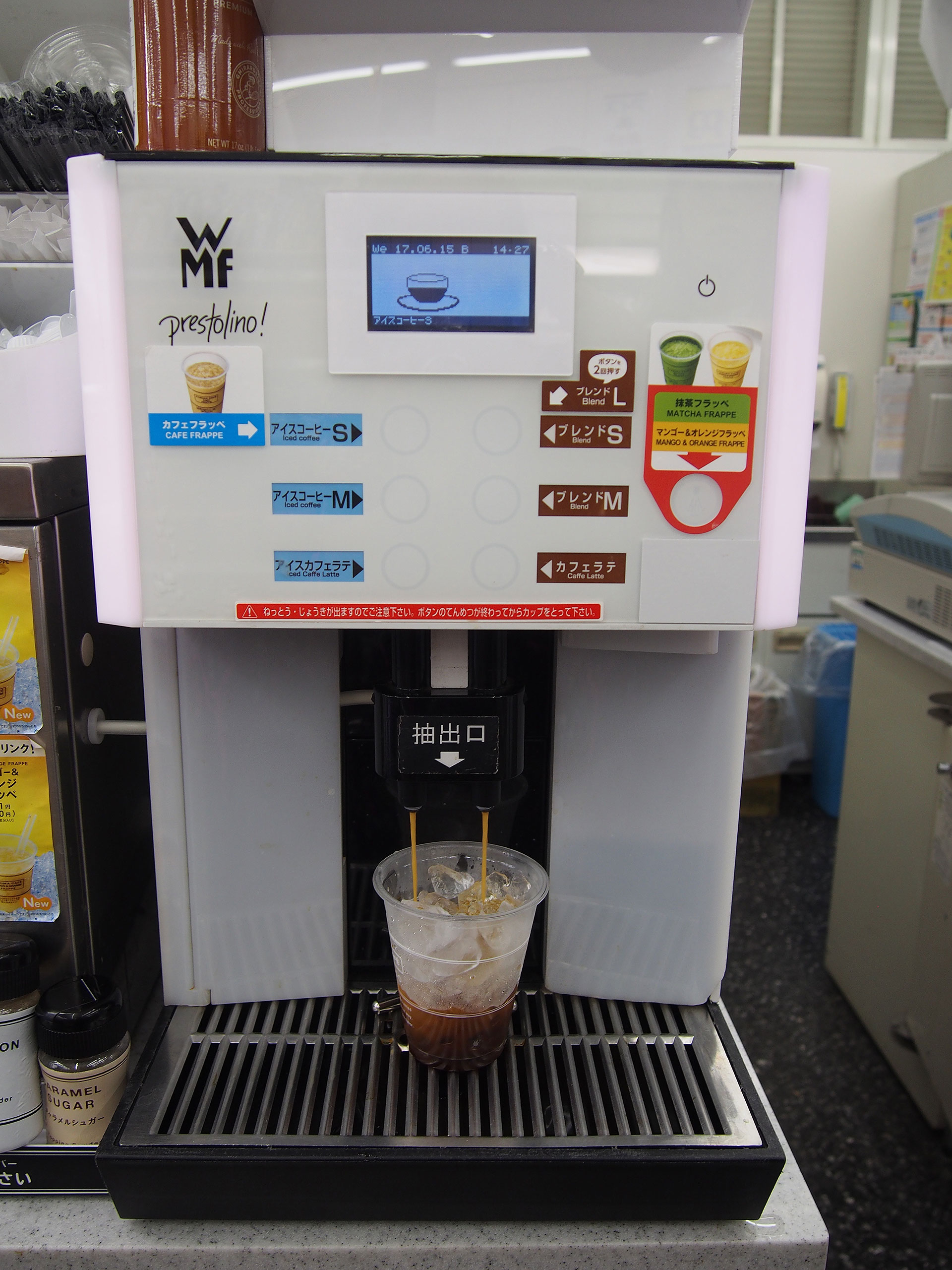 กาแฟร้านสะดวกซื้อแบบบริการตัวเอง แถมราคาย่อมเยาด้วย แก้วนี้ 180 เยน ได้กาแฟดำ ถ้าลาเต้ก็แค่เพิ่มเงิน และหยิบครีมในถ้วยเล็กๆ เติมลงไปตามความพอใจ พร้อมไซรัป