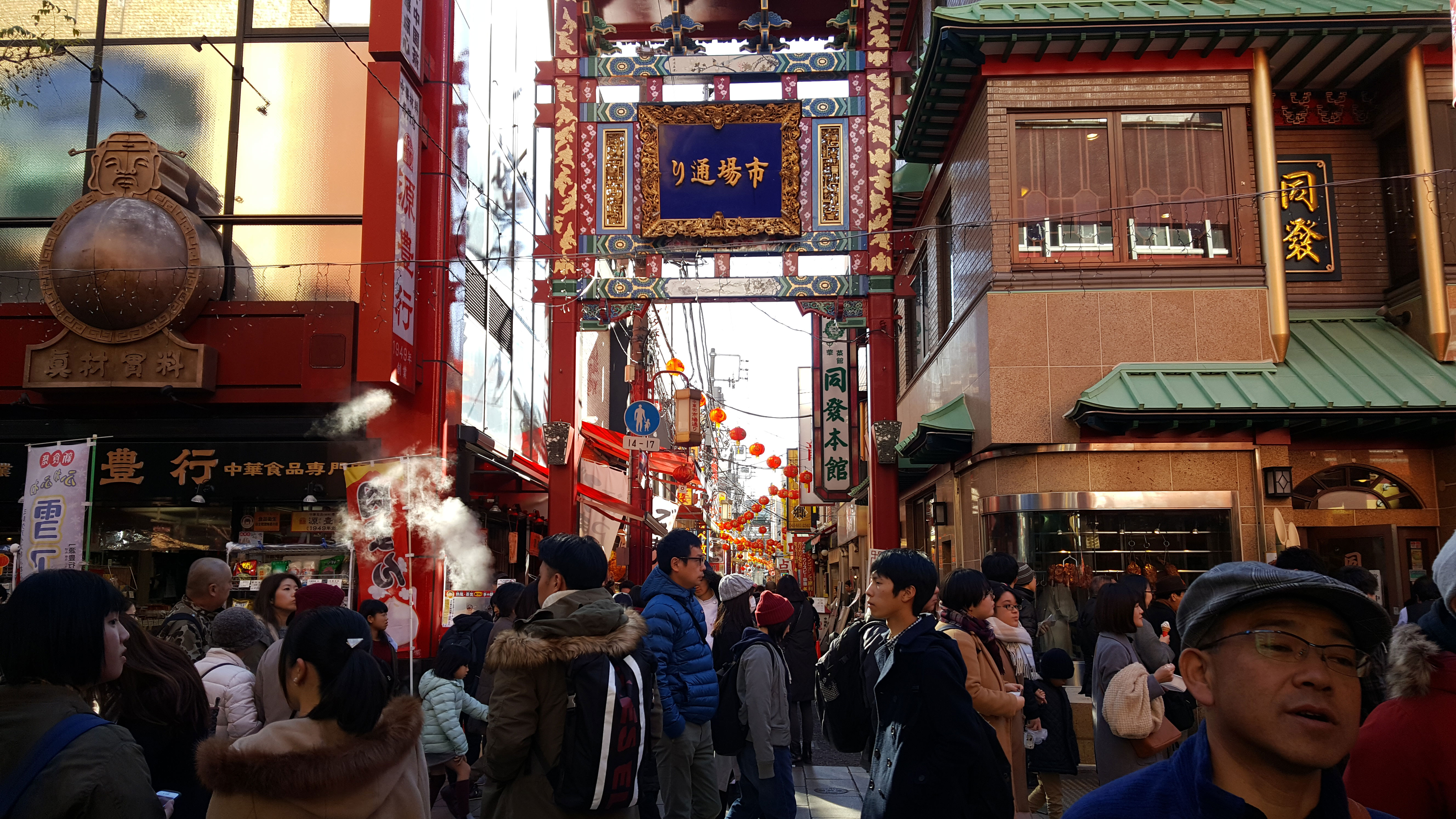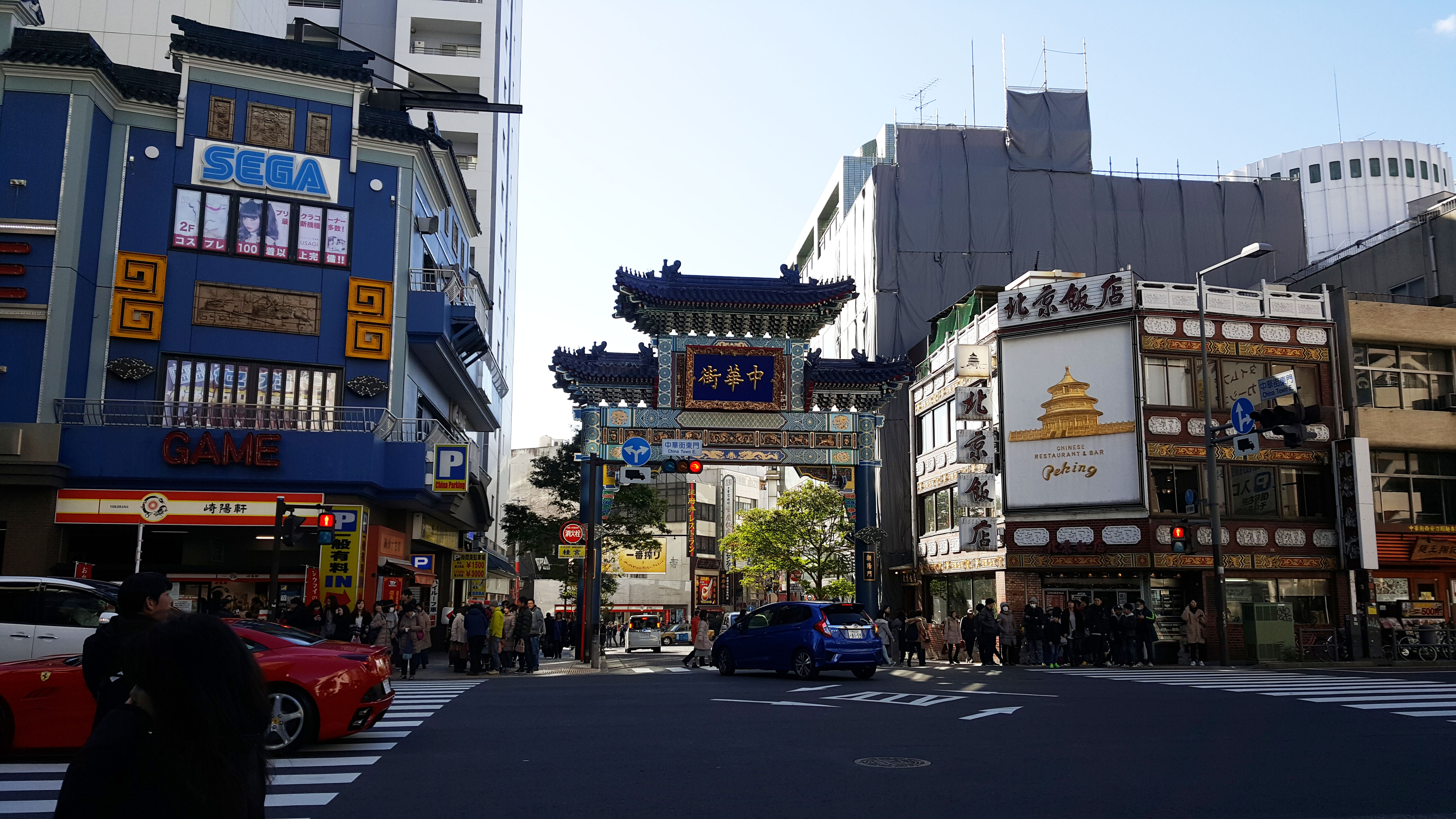 ซุ้มประตูฝั่งรถไฟใต้ดินโมะโตะมะจิจูกะไง (Motomachichukagai) จากบริเวณนี้เดินอีกราวร้อยเมตรก็เชื่อมต่อกับโซนอ่าวโยะโกะฮะมะ ไล่ตั้งแต่สวนยะมะชิตะ สวนโซนะฮะนะ โกดังอิฐแดง และย่านมินะโตะมิไร